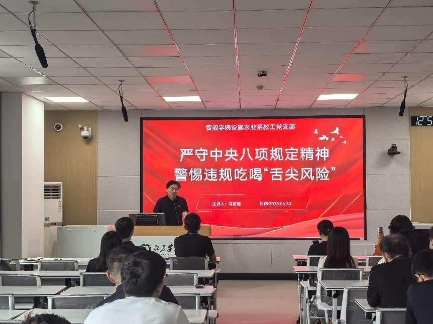 M88官方网站设施农业系教工党支部书记马前磊聚焦于严守中央八项规定精神,以警惕违规吃喝“舌尖风险”为主题开展党课。他紧密联系教师的教育工作以及员工的日常行为,通过生动详实的案例,深入剖析了违规吃喝现象的危害性,解读了整治违规吃喝的各项规定,为党员们敲响了廉洁自律的警钟,引导大家在教育一线和日常生活中自觉抵制不良风气,树立清正廉洁的良好形象,切实履行好教书育人、为人师表的职责使命。
