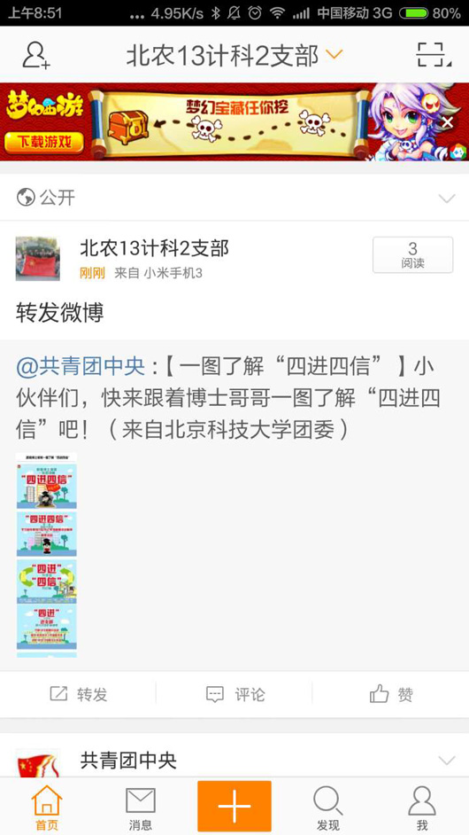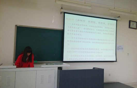 2012级、2013级各团支部分别通过微博、微信等渠道开展“四进四信”主题团日活动,将新媒体与团日活动相结合,将理论学习和新媒体宣传相结合,深入展开宣传、讨论和学习。在理论学习阶段,各支部同学认真观看了习近平总书记的系列讲话,随后,同学们利用新媒体手段进行深入讨论,纷纷发表自己的看法。许多同学对新媒体和团日活动的结合表示非常支持,纷纷点赞和转发。