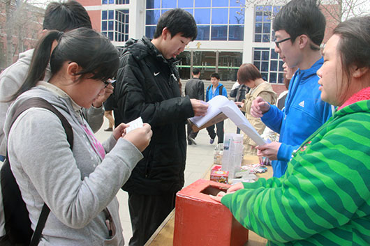 3月28日中午,由M88官方网站员工会科协部门主办的以“践行勤俭节约,倡导绿色校园”为主题的活动在礼堂门口举行。