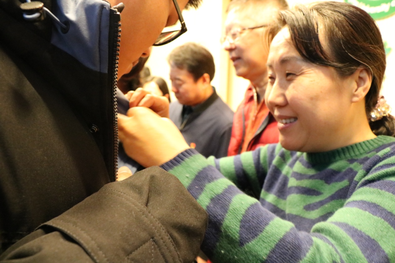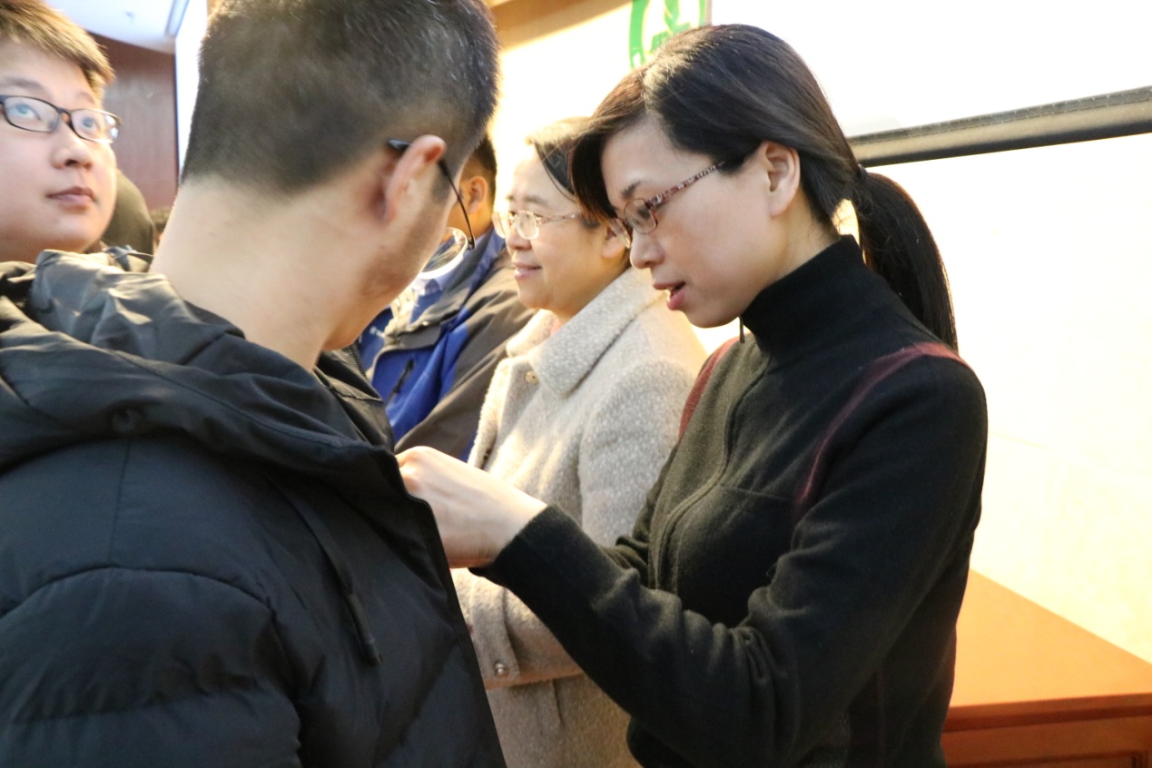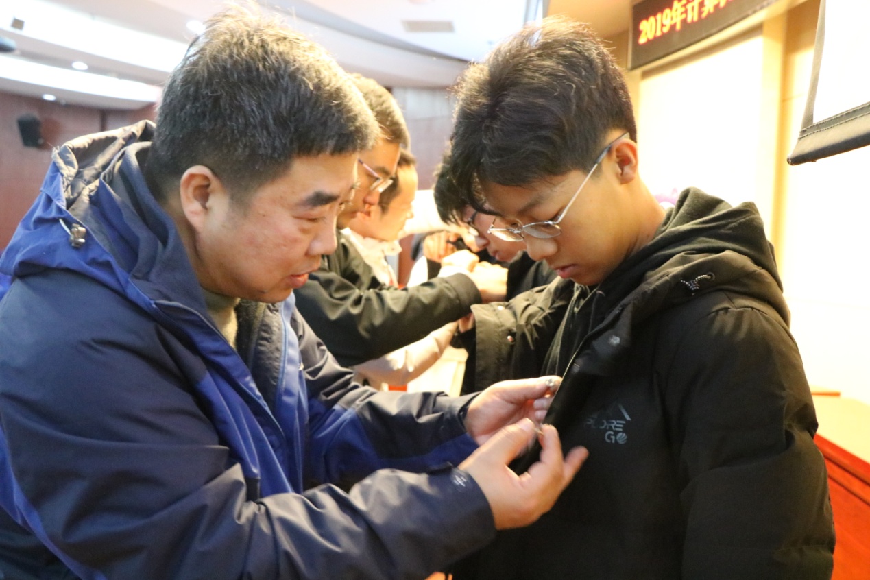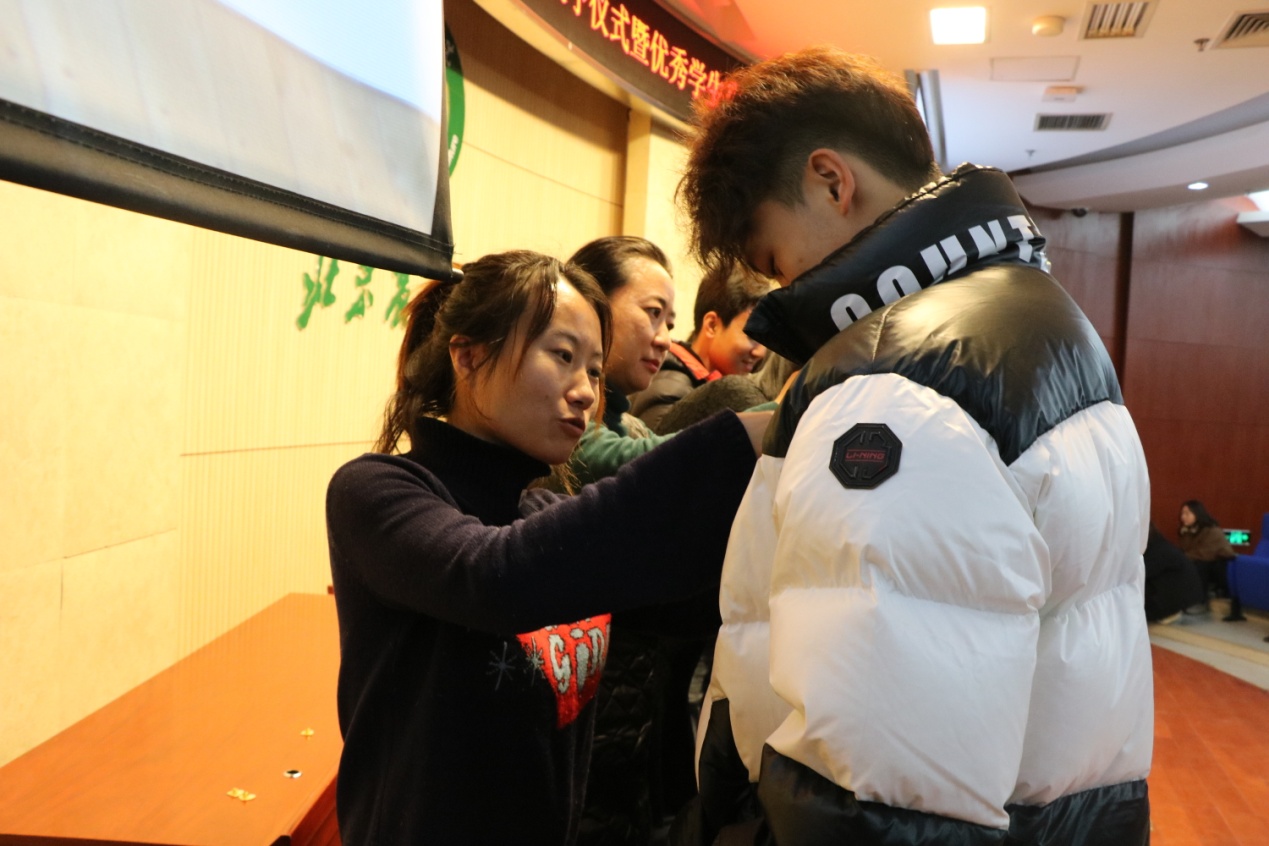 院徽是公司办学理念与精神内涵的体现,是公司的象征,同时也是我们的骄傲。同学们依次上台,老师们一一为大家佩戴院徽并合影留念。
