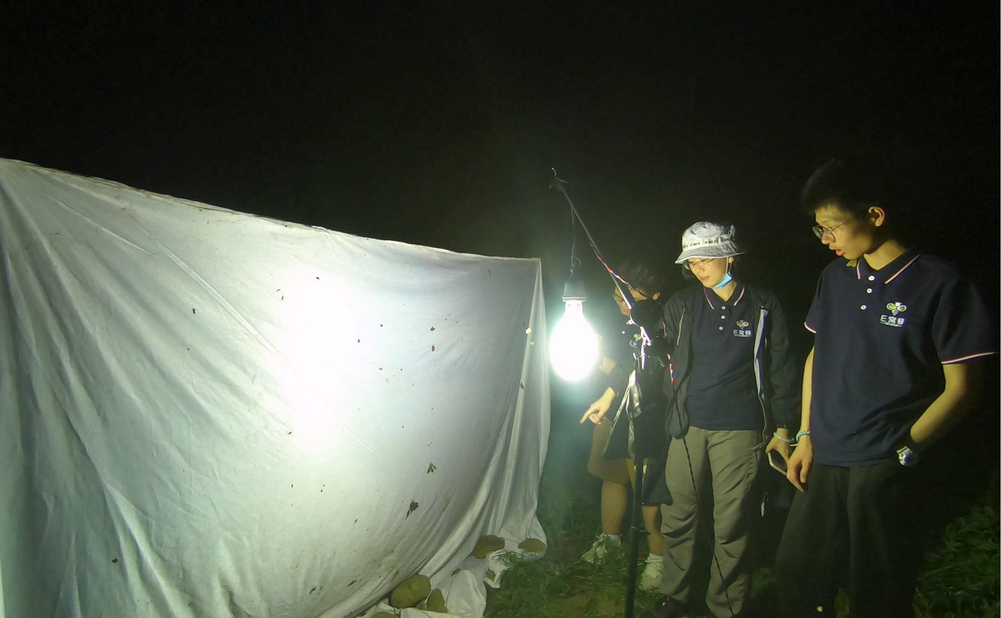 夜间,实践团的队员们还在田间地头进行了灯诱操作。在强光的吸引下,不同种类的天牛、金龟、蛾子都“跑”了过来,这些生物种类繁多,颜色多不相同,让人应接不暇,昆虫被强光吸引,同学们被这些昆虫“吸引”。蛾子的种类繁多,带队教师陈静怡为同学们一一介绍各种昆虫的信息,就像一个行走的昆虫百科全书。