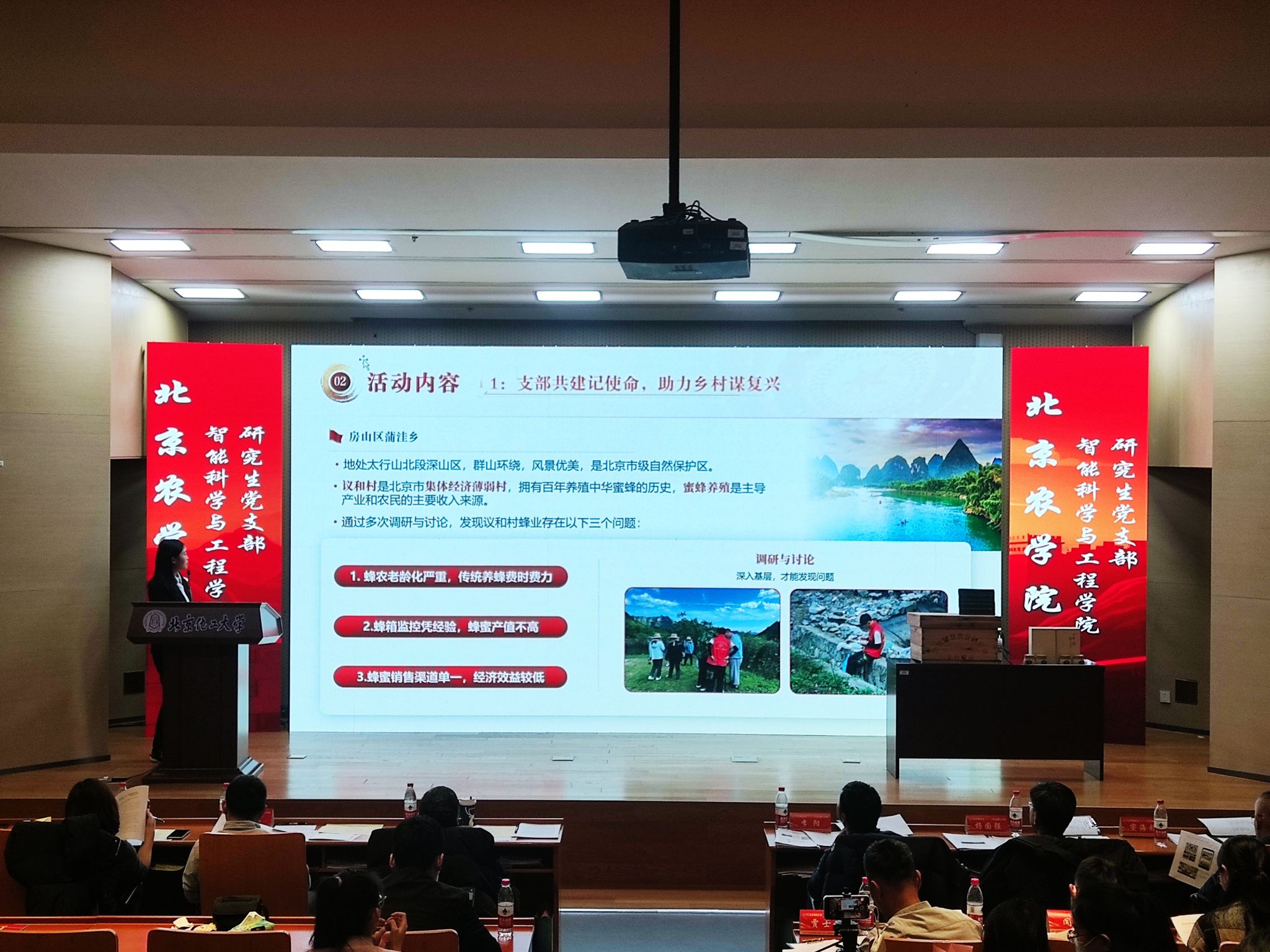 研究生党支部以“党建引领聚合力,红色引擎促发展,数字科技赋能议和村产业振兴”为主题,通过“乡村调研+科技赋能+实践帮扶”相结合的模式,与房山区蒲洼乡议和村党支部开展红色“1+1”共建活动,带领员工党员研发智能蜂箱,创建E窝蜂公众号,拓展销售渠道,帮助议和村中华蜂产业提质增效,壮大村集体经济带动村民增收。